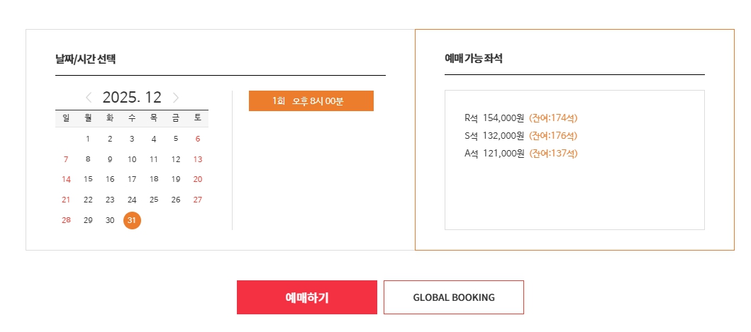 본 공연은 전석 지정좌석제로 운영되며, 예매는 예스24 티켓을 통해 진행됩니다. 공연일이 연말에 집중되어 있어 조기 매진 가능성이 높으므로 관심 있는 분들은 예매 일정을 미리 확인하는 것이 좋습니다.